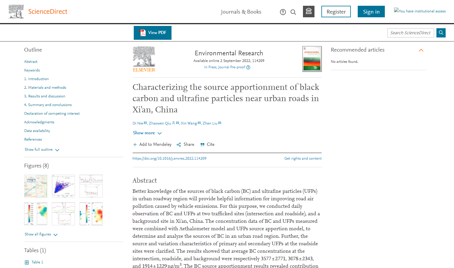 2022年9月2日,国际重要期刊《Environmental Research》(IF=8.431,top Journal)在线发表了成人漫画 邱兆文教授团队的研究成果“Characterizing the source apportionment of black carbon and ultrafine particles near urban roads in Xi'an, China”。该论文第一作者为成人漫画 硕士研究生聂迪,邱兆文教授为通讯作者。