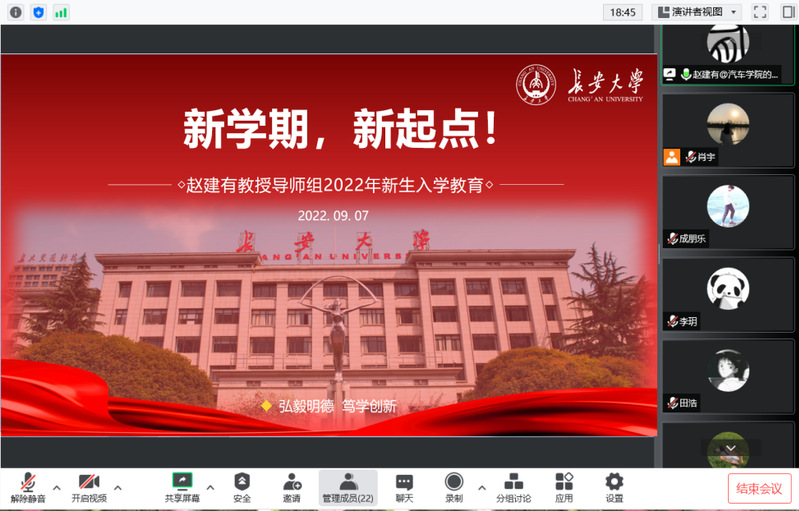 会议最后,赵建有教授从研究生学习科研、能力培养、人际交往以及研究室日常事务等方面对新生提出了具体的要求,并再次对2022级硕士研究生表示欢迎,希望大家能够坚持初心使命,鼓励同学们在培养自身扎实基础知识和专业能力的同时,明确自身发展目标,做好规划,不断追求奋斗,照亮前程,拓展国际视野,争做高层次、创新性、复合型人才,用坚持谱写出人生新篇章!