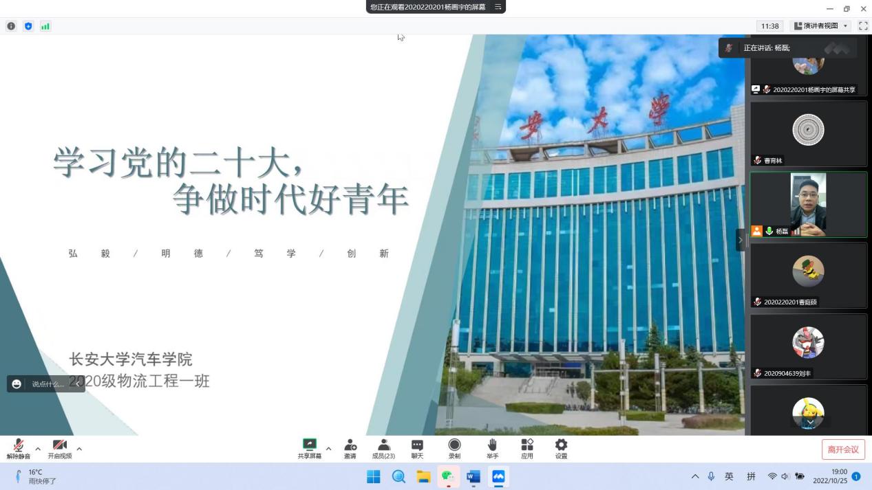为深入学习党的二十大精神,全面落实好学校防疫工作各项要求,10月25日,成人漫画 2020级物流工程一班举办“学习党的二十大,争做时代好青年”主题线上班会。成人漫画 副院长赵轩教授出席本次班会,2020级物流工程一班全体同学参会,本次班会由2020级辅导员杨磊主持。