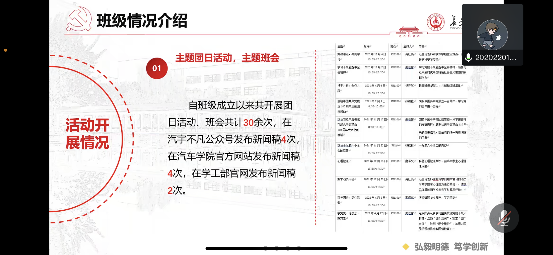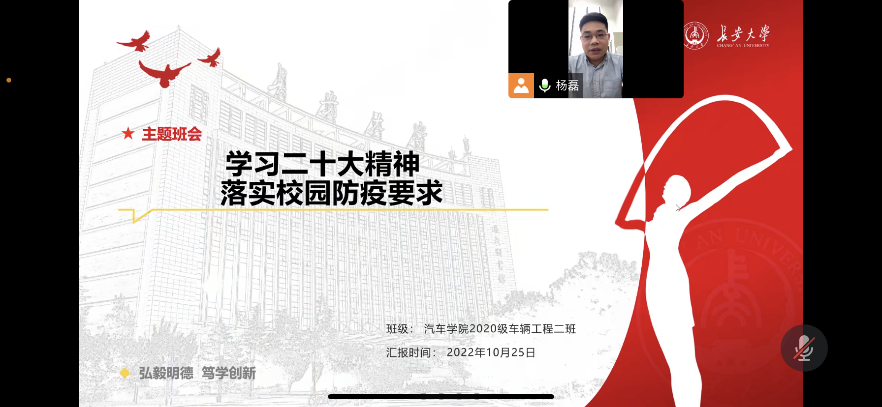 班长张锦程从班级构成、活动展开和获奖情况介绍了班情概况,团支书姜佳馨领学党的二十大报告,从学习党的二十大、永远跟党走、奋进新征程和强国有我四个部分带领大家全面回顾了党的二十大报告;杨天一、于青禾两名同学分别从学习党的二十大报告和校园防疫方面分享了他们的学习感悟。