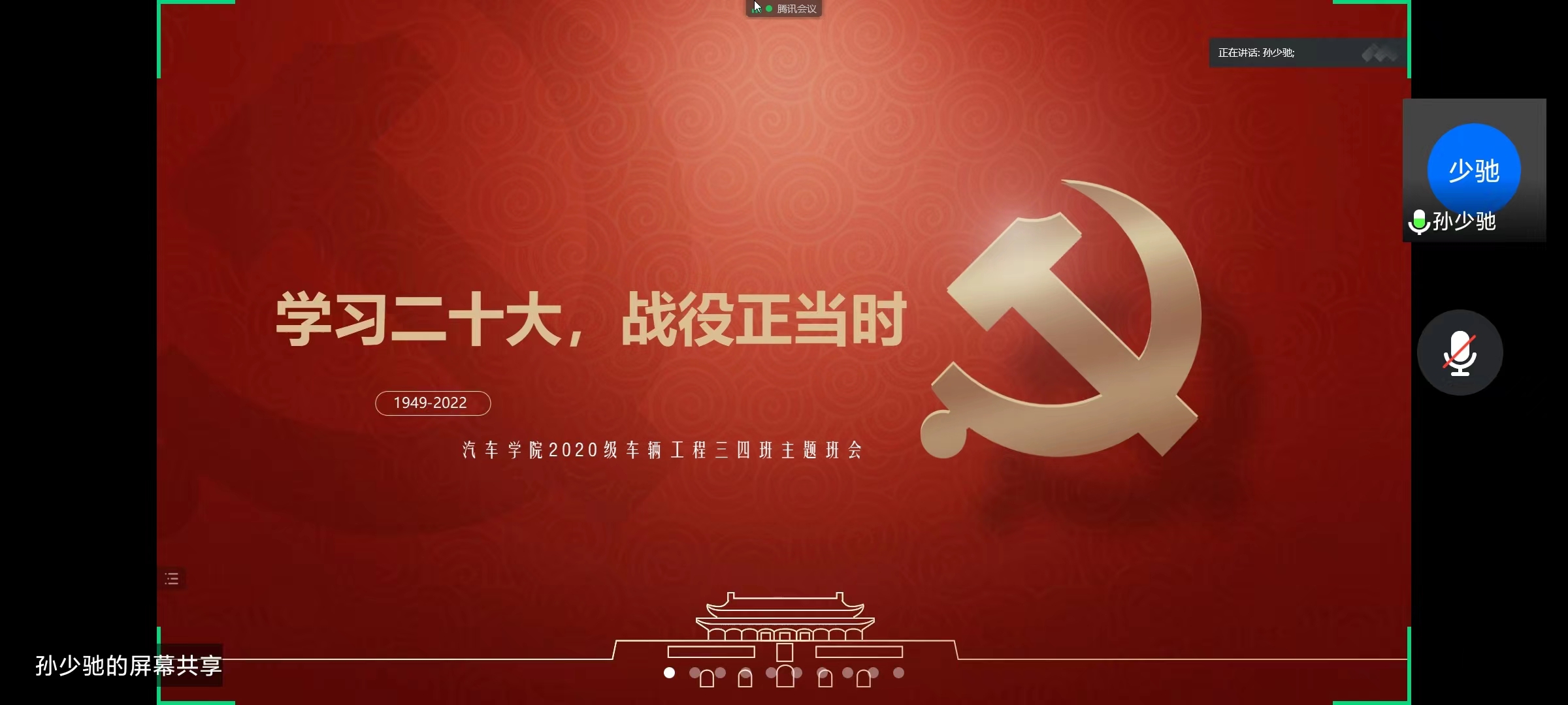 为深入学习党的二十大精神,贯彻落实学校防疫措施,10月27日,成人漫画 2020级车辆工程三四班联合举行“学习党的二十大,争做抗疫生力军”线上主题班会。班会由车辆工程三班班长孙少驰主持。