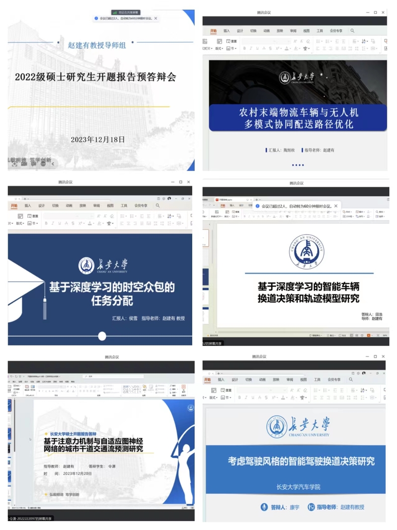 硕士研究生陶旭秋汇报了《农村末端物流车辆与无人机多模式协同配送路径优化》,采用车辆与无人机协同配送模式,通过考虑运输成本、客户满意度、碳排放量构建多目标路径优化模型,解决农村末端配送问题;田浩汇报了《基于深度学习的智能车辆换道决策和轨迹模型研究》,采用HighD数据集进行数据处理,提取车辆的关联车同换到车辆之间的位置、速度关系等,实现对换道行为的准确预测;侯雪就开题报告《基于深度学习的时空众包的任务分配》,介绍关于服务器分配任务方式,同时分析了道路交通流以及众包配送员对绕路的偏好对任务分配的影响;令潇汇报了《基于注意力机制与自适应图神经网络的城市干道交通流预测研究》,通过动态路网图生成模型以及邻接矩阵优化构建GCN的交通流模型,引入注意力机制,得到模型精确度结果。康宇开题报告题目为《考虑驾驶风格的智能驾驶换道决策研究》,通过车辆数据轨迹预测和智能车辆换道决策模型,进行了考虑驾驶风格波动特征的周边车辆换道行为预测,并进行了实例验证。