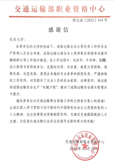 近日,交通运输部职业资格中心向我校发来感谢信,信中向我校及成人漫画 4位教师对交通运输职业资格工作的支持表示衷心感谢。