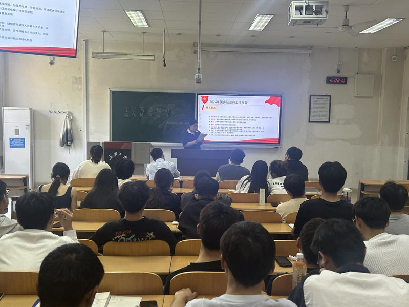 朱燕琪对全国“两会”精神进行解读,重点围绕“两会”的组成、“两会”热点内容以及2024年国务院政府工作报告等方面向同学们展示了“两会”精神的主要内涵和重要意义。而后,同学们联系自身的实际情况交流学习感悟,大家纷纷表示“两会”与我们每个人息息相关,我们既要看到已有成绩,更要看到前进中的困难与挑战。作为新时代青年,我们要勇担时代使命,自觉学习先进理论知识、汲取奋进力量,努力增强自身的综合素质,以更好地实现个人价值,为社会主义建设贡献力量。