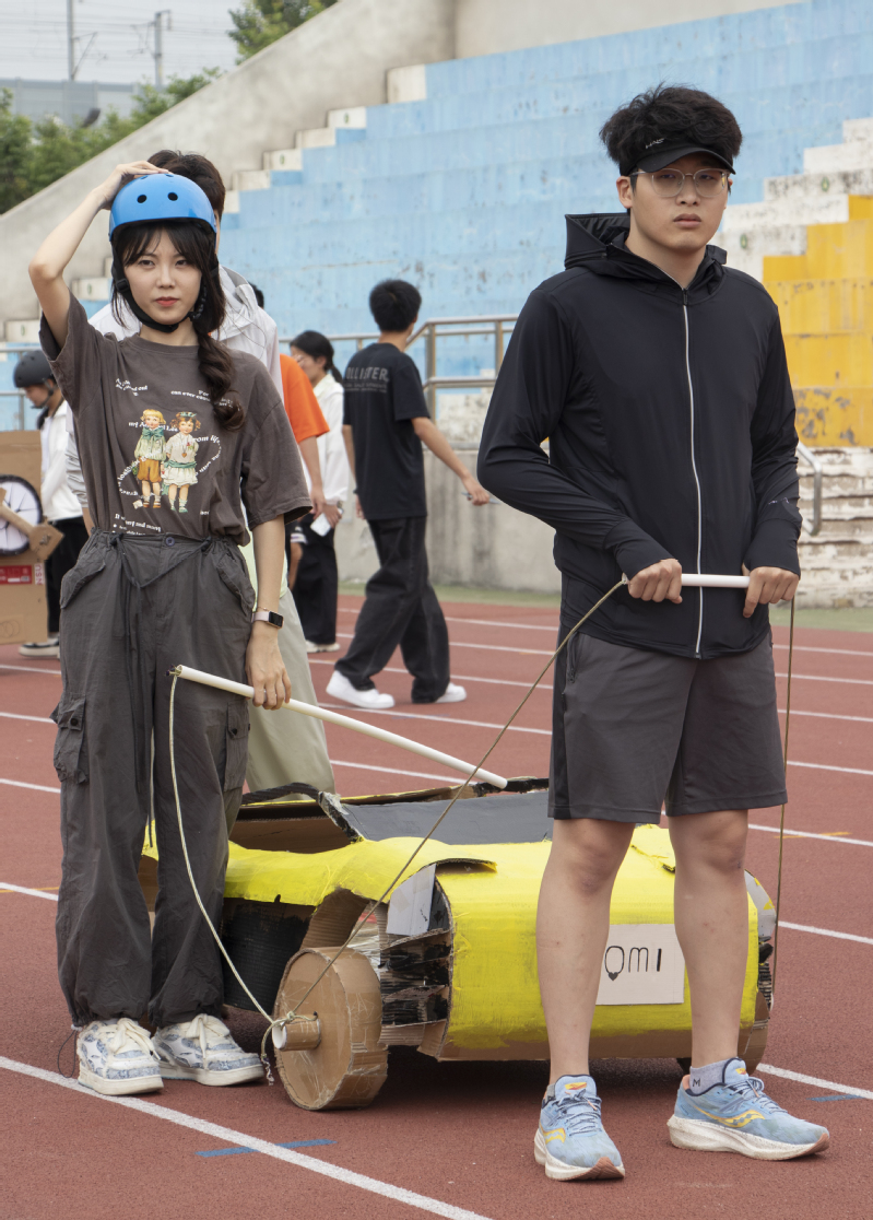 第二个环节为趣味竞速赛,在这个环节中,每支队伍需要在长达五十米的跑道上进行竞速比赛,在考量纸箱车性能的同时也考验了学生团队的合作能力。