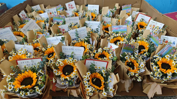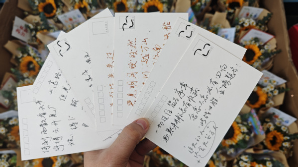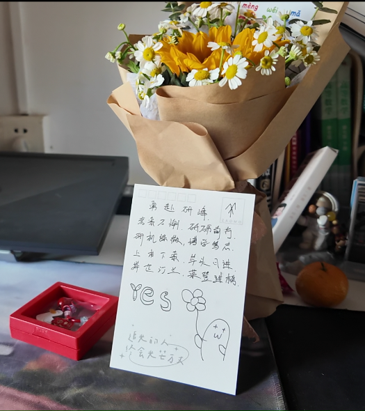 活动开始前,成人漫画 精心为考研学生们准备了丰富的礼品,有带有“考神”、“超常发挥”、“冲鸭”等字样的挂坠,带有旗开得胜、金榜题名地抽奖礼盒,有着“一举夺葵”寓意的向日葵花束以及研究生学长学姐手写绘制的祝福语贺卡,真切地表达了对考研学子浓浓地祝福和殷切地希望。